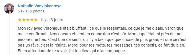 12/24 « Véronique, je te remercie chaleureusement pour notre belle séance mais aussi pour ton accueil, ta bienveillance et ton écoute. Je n’ai jamais vécu une telle expérience dans ma vie et cela arrive à point nommé. Je ressens déjà moins de douleurs physiques et j’avais déjà ressenti un soulagement significatif dès après notre rencontre. Notre rencontre élève encore un peu plus ma conscience de l’immatériel et son importance dans nos vies terrestres. » L.